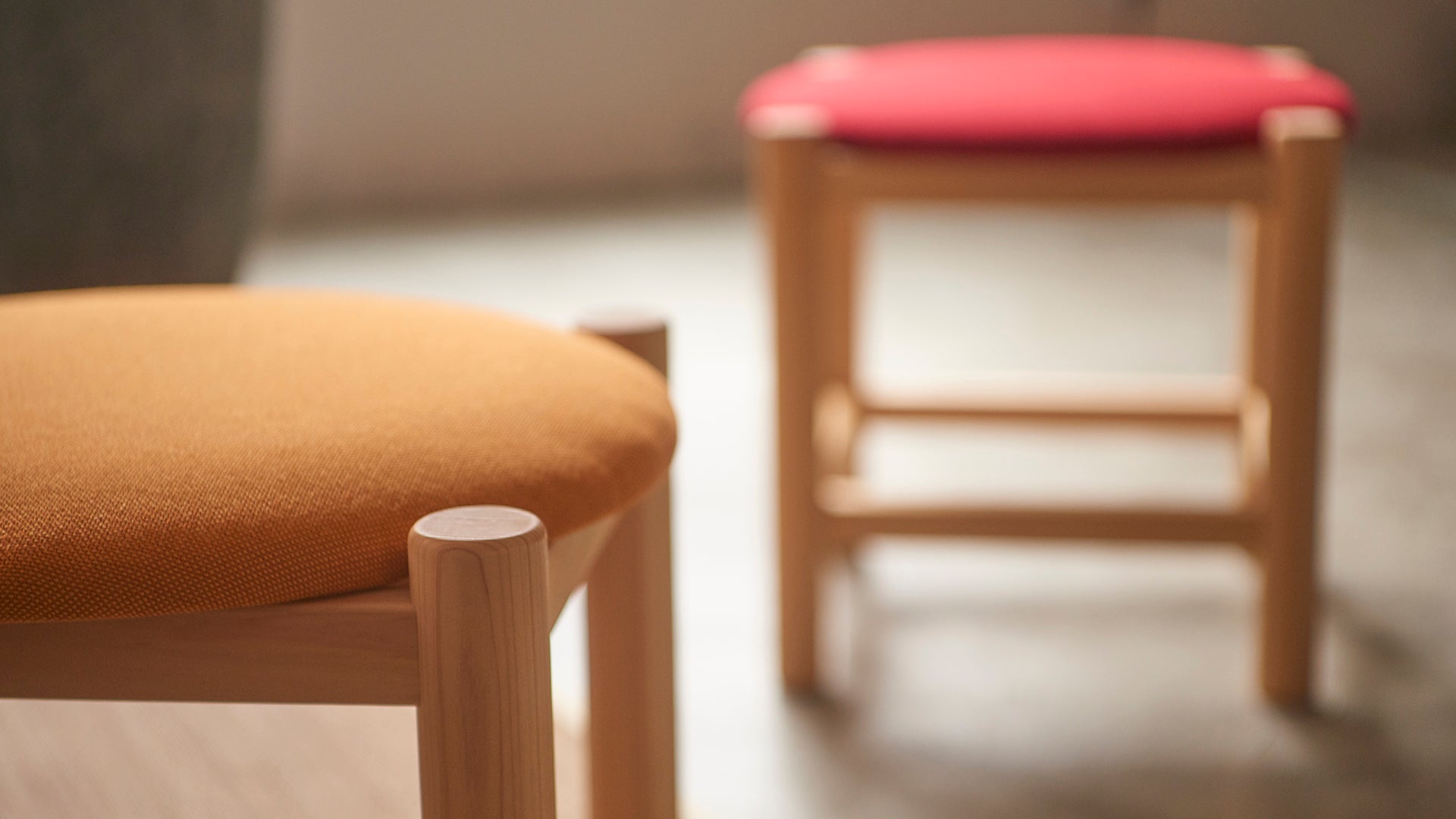 【椅子(チェア・スツール)】フレーム・板座面 | 天然木(ヒノキ)、布座面 | 積層合板、クッション材 | ウレタンフォーム・チップウレタン、表面加工 | オイル塗装(オスモカラー)